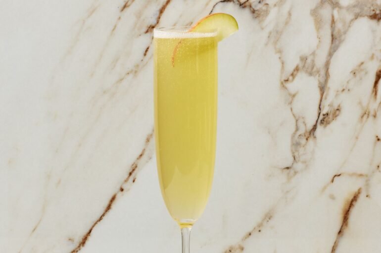 A lemon peel and apple slice for garnish double down on the notes present in the cocktail. This simple cocktail is refreshing and, when served in a festive flute glass, perfect for toasting a special autumn occasion.