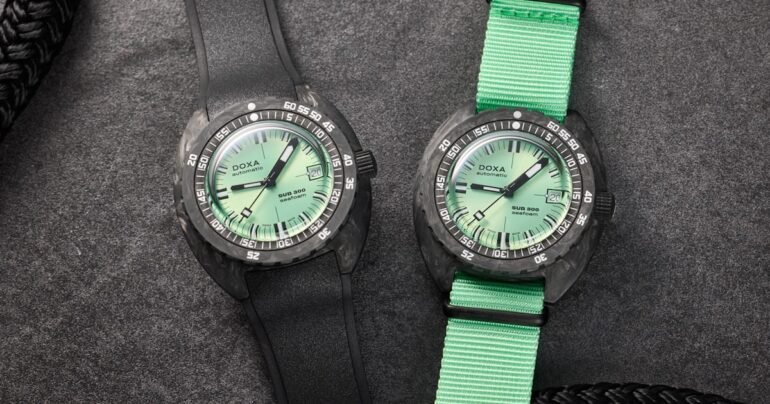 I have to admit some bias from the top here, as I am a huge fan of the Sub 300 Carbon (as stated in the above-linked stories), and Watches of Switzerland owns Hodinkee. That said, I was surprised to see this new model hit my inbox this morning and then even more surprised when I found myself rather interested in what, on paper, feels like it would be a strange combination of color and material for a limited edition Doxa. Nine times out of ten, I prefer my Doxas in one of the classic colorways, but to my surprise, this shimmering light green dial looks really good against the greys and blacks of the carbon case.