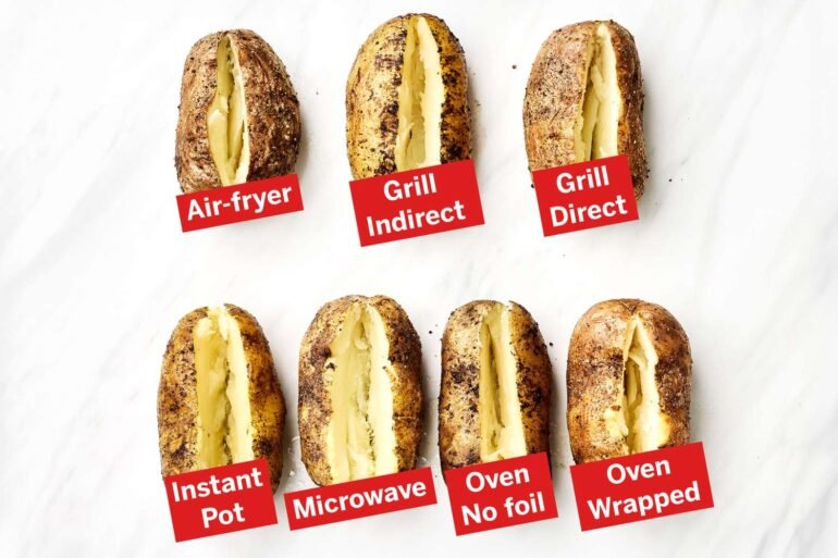Testers tried seven different methods: pressure-cooking in an Instant Pot, microwaving, grilling over indirect heat, grilling over direct heat, wrapping in foil and baking in the oven, baking without foil, and air-frying. The goal was evenly tender and fluffy interiors with crispy and flavorful skin.