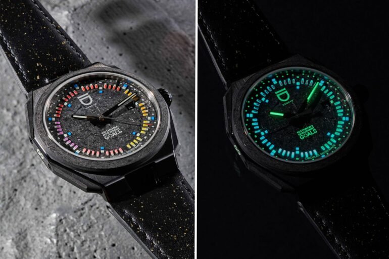 The Sustainable Development Goals limited-edition timepiece isn’t an entirely new watch. It’s based on the watch within the brand’s Circular C collection. That “C” stands for carbon, but not just any kind of carbon. A company called CompPair developed the carbon fiber in the bezel and the bumpers on the sides of the case. It features so-called HealTech, meaning that if it’s heated to between 100 and 150 degrees Celsius, imperfections will self-heal. This advanced material also helps to make repairing trains and spacecrafts less costly and more sustainable.