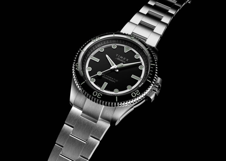 Timex says the Marine M1a is the “next chapter” in the brand’s history as it continues to build watches in Switzerland with higher-end materials and movements than typical Timex watches. In the case of the Marine M1a, that means a 41mm skeletonized stainless-steel case with an iron-plating coated midcase, a brushed-steel bracelet, a ceramic bezel, Superlominva-filled indices, and an enamel dial. The watch is powered by a Catena SA100 automatic movement finished with Geneva stripes and perlage that you can get an easy look at through the watch’s exhibition caseback.