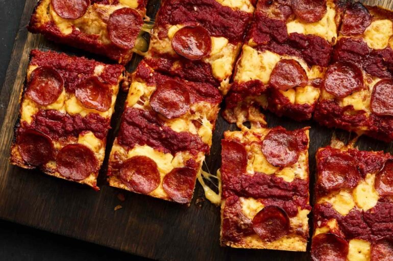 Detroit-style pizza has a number of unique qualities that set it apart from its classic Neapolitan-, New York–, and Chicago-style counterparts. First, it’s baked in a rectangular or square pan. For toppings, a bottom layer of lusciously melted cheese goes all the way to the edges of the deliciously caramelized and crispy crust. Pepperoni is layered both on top and underneath the cheese, and “racing stripes” of flavorful tomato sauce top the whole affair.