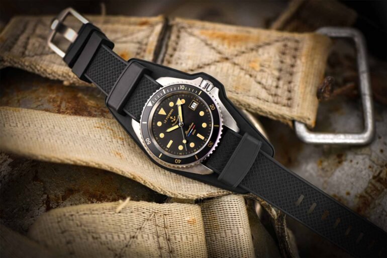 The real star, of course, is the strap itself. Le Forban has reinvented the classic bund in FKM rubber. This, surprisingly, has never been done before and somehow works perfectly for this particular diver. The central pad can be removed for a more traditional strap look, or swapped altogether for the optional steel bracelet. It’s a small innovation like making a bund-style strap in rubber that proves there’s still room to rethink the old favorites. Whether the same can be said for high heels or jockstraps, well, only time will tell.