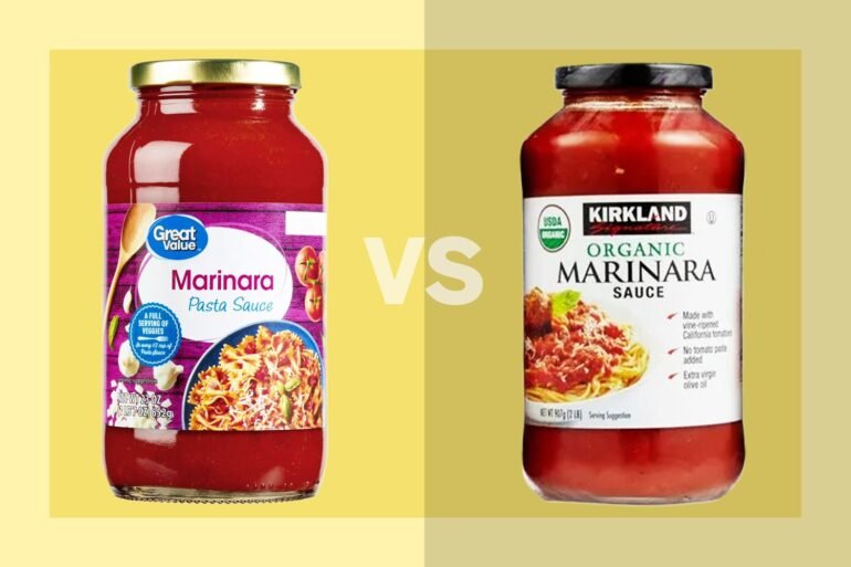 When you line up the two jars — Costco’s Kirkland Signature Organic Marinara Sauce and Walmart’s Great Value Organic Marinara Pasta Sauce — the ingredient panels reveal a clear story about how each brand defines quality.