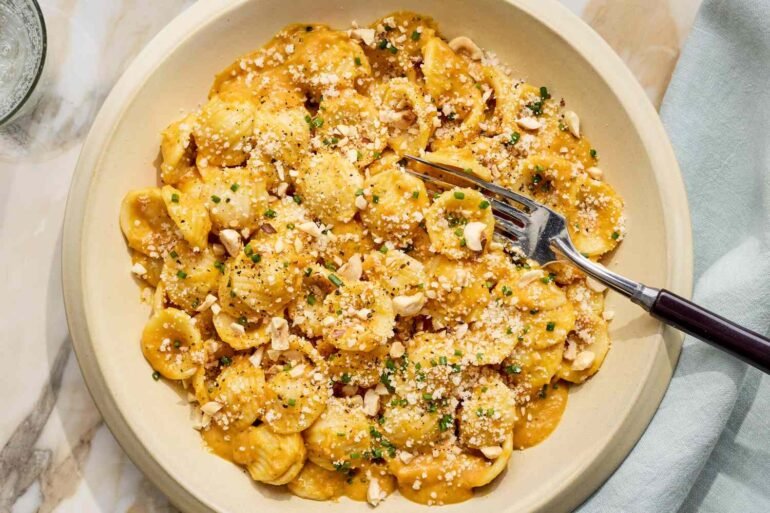 Orecchiette is a classic Italian pasta shape that originated in the Puglia region of southern Italy. Its name, which translates to “little ears,” comes from the pasta’s ear-like, concave shape that measures about 3/4-inch across. Orecchiette’s ridged surface and hollow center help it hold onto sauces like this velvety pumpkin. If you can’t find it, farfalle is a good option.