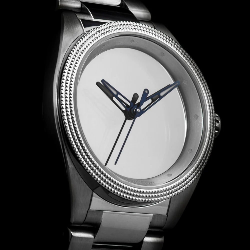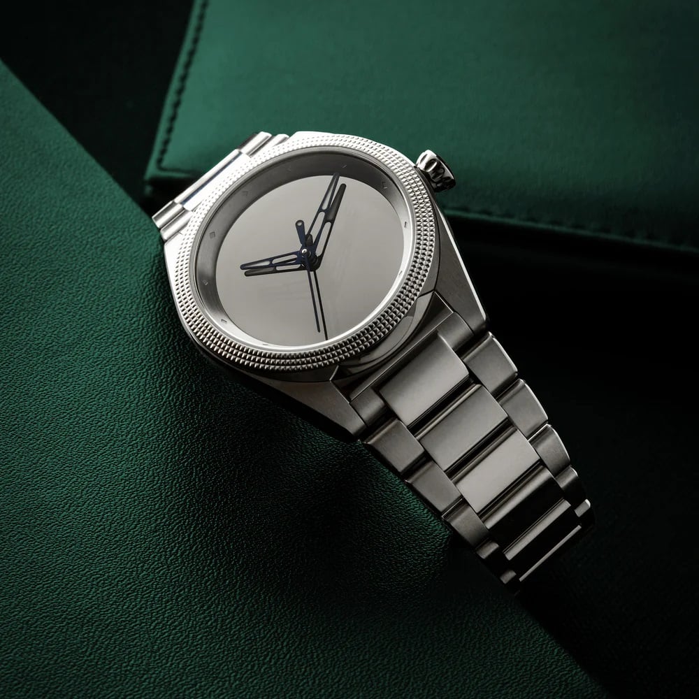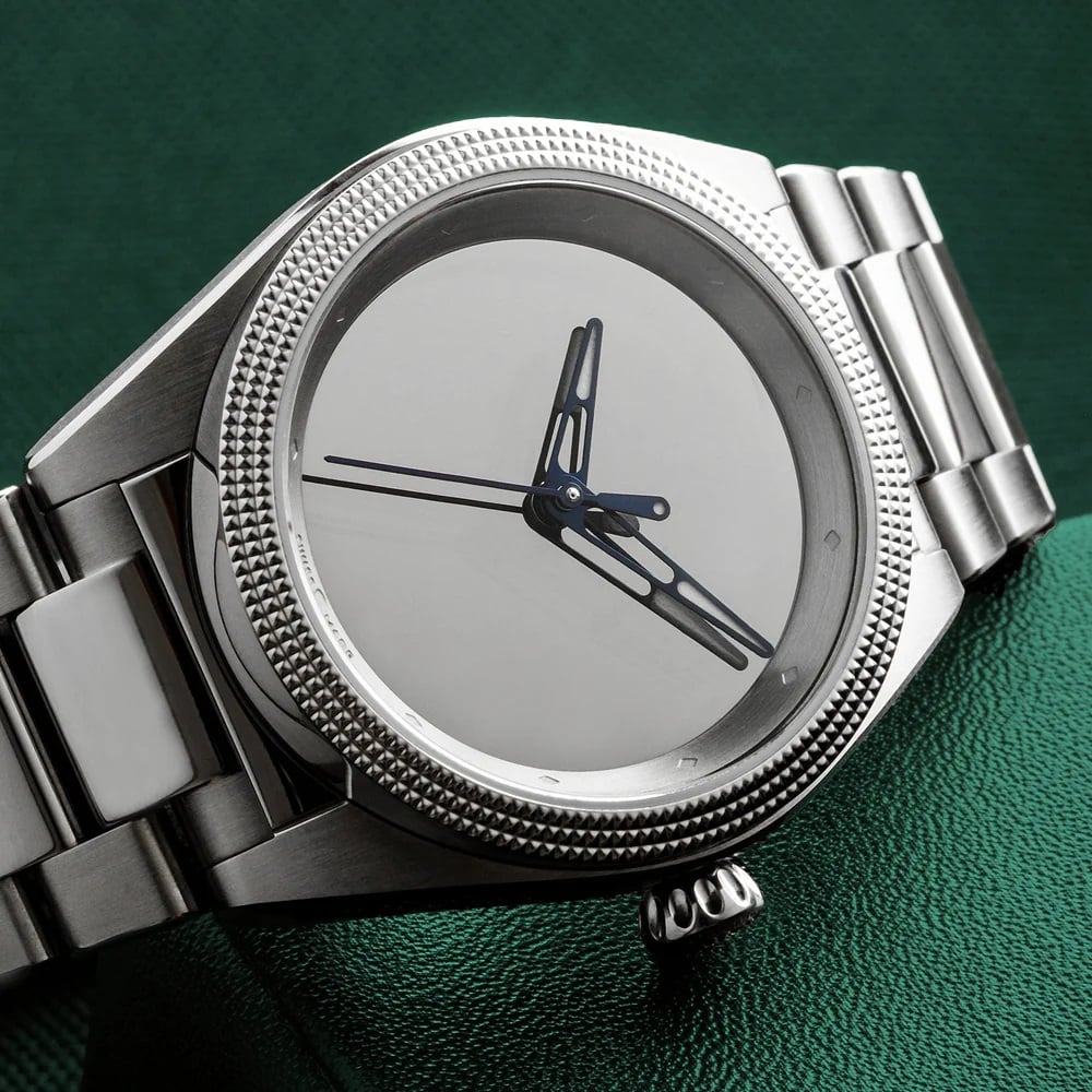 The Isotope Flyway Fata Morgana features a 36mm stainless steel case built in three parts, featuring polished, brushed, and sandblasted finishes. With a 12.3mm thickness and a 42mm lug-to-lug, it is compact yet substantial. A Clous de Paris bezel frames the dial, while the brand’s signature hyperbolic paraboloid sapphire crystal enhances clarity and gives the watch its sculptural presence. The mirror-finished push-pull crown at 3 o’clock is signed with the brand’s Lacrima logo. The Flyaway Fata Morgana comes on a steel bracelet with 18mm-wide quick-release end links and a butterfly clasp. Isotope rates the watch’s water resistance at 100 meters.