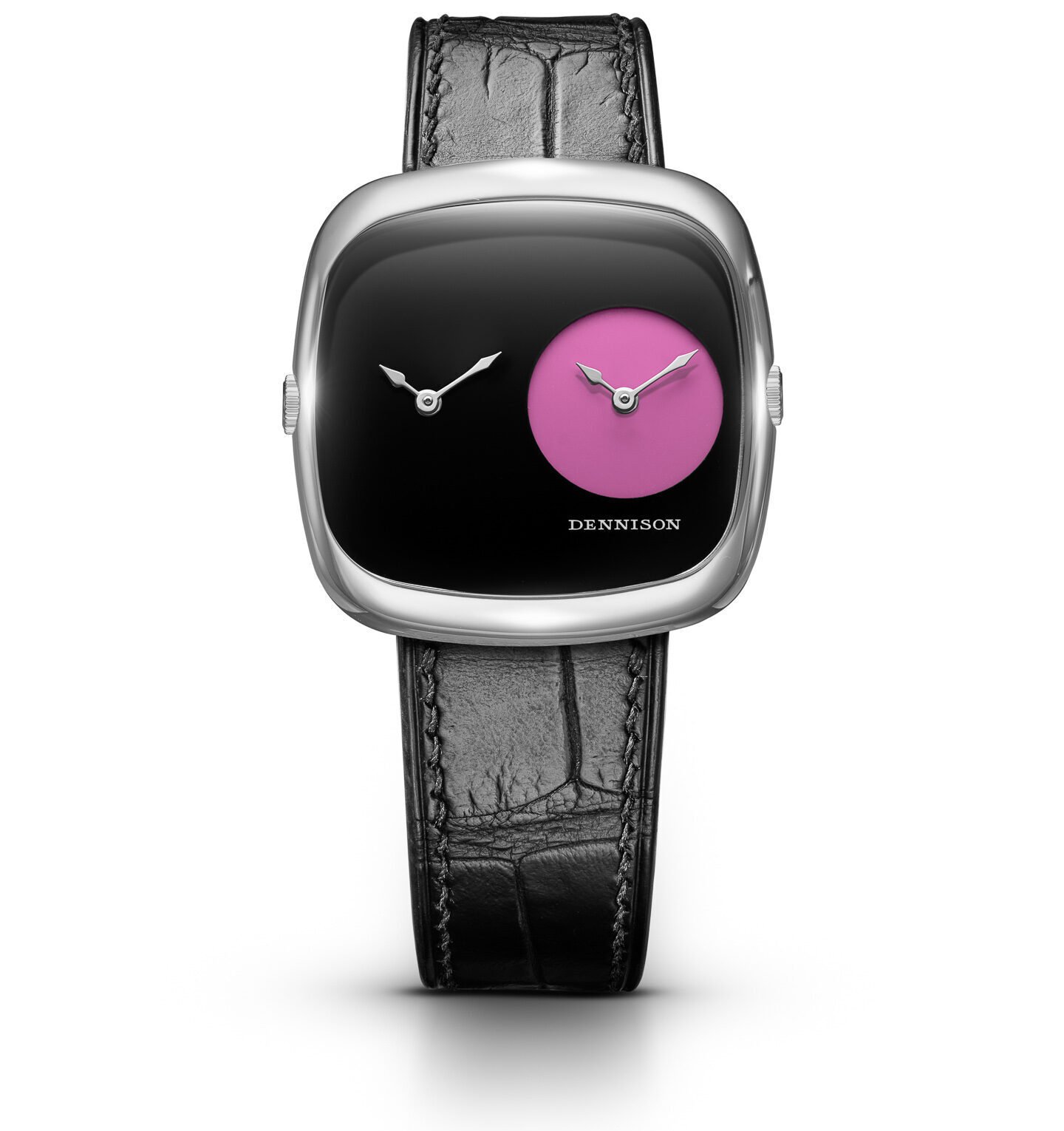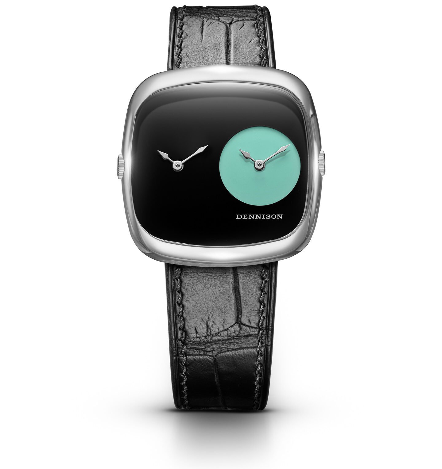 In keeping with Dennison’s reputation for stone dials, the Dual Time Capsule Collection II models have dials made of black onyx. The sole exception is a round area in red, pink, or turquoise, which serves as the rightmost time display. This creates a simple yet visually impactful look for the dial. In fact, the watches could be seen as distant cousins to the once-famous Movado Museum watch. Inside, they continue to use twin Ronda 1032 quartz movements. A crown on each side of the case adjusts the corresponding handset.