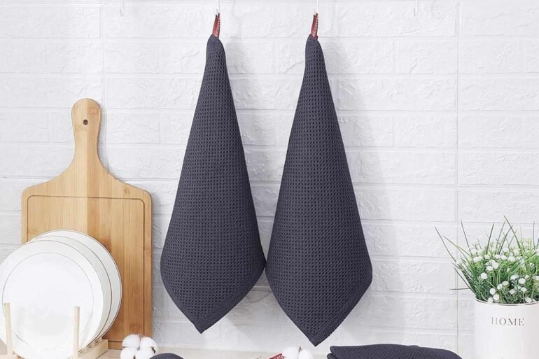 Each cotton towel features a waffle weave texture that soaks up moisture and dries quickly. The towels are 12 x 12 inches, which shoppers say is large enough to handle everything from drying dishes to wiping countertops. There’s a loop on one corner, so you can hook a towel on a hook within reach.