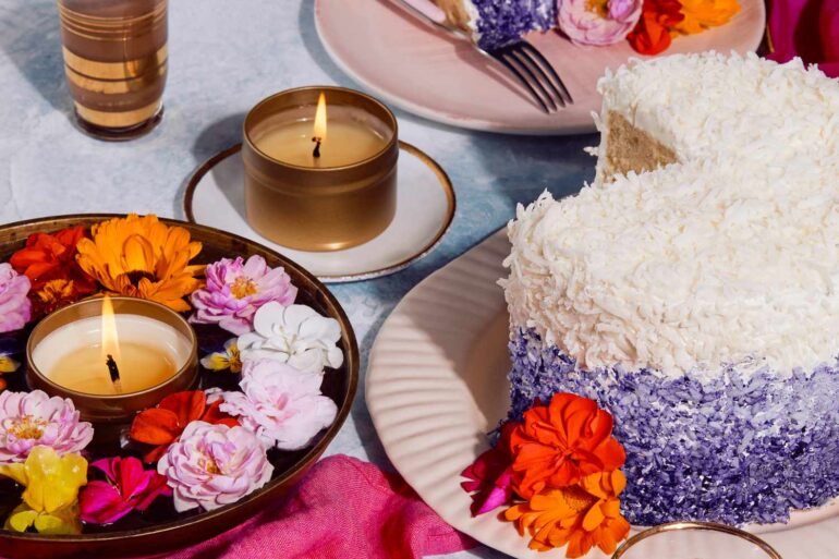 Inspired by classic coconut burfi, this layer cake from cookbook author and blogger Hetal Vasavada tucks a chewy coconut filling inside Swiss meringue buttercream. A shower of purple-to-white coconut flakes creates a celebratory ombré that feels tailor-made for the holiday table. The crumb stays incredibly moist thanks to coconut milk.