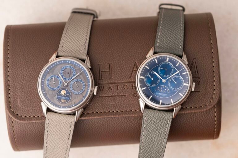 The Annum arrives in a 38mm case with a distinctive lug profile that borrows from earlier Haim releases and places it squarely in the tradition of classic, midcentury watch design. Four subdials track the month, date, moonphase, and the day of the week, and there are three dial variants available at launch: Dark Cobalt, Stone White, and Fumée, the latter of which is clearly the showstopper of the group, with smoked sapphire dial that give you a peek at the movement beneath it. The white and cobalt variants each of guilloche that is achieved through CNC machining (not stamping).