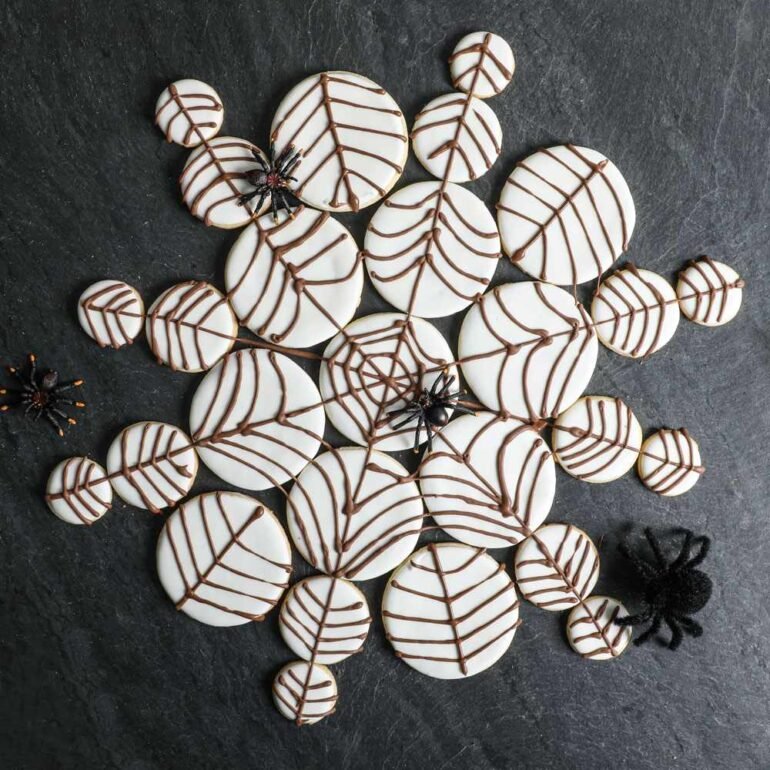 - The playful and elegant piped chocolate spiderweb design turns a simple sugar cookie into a show-stopping Halloween treat.