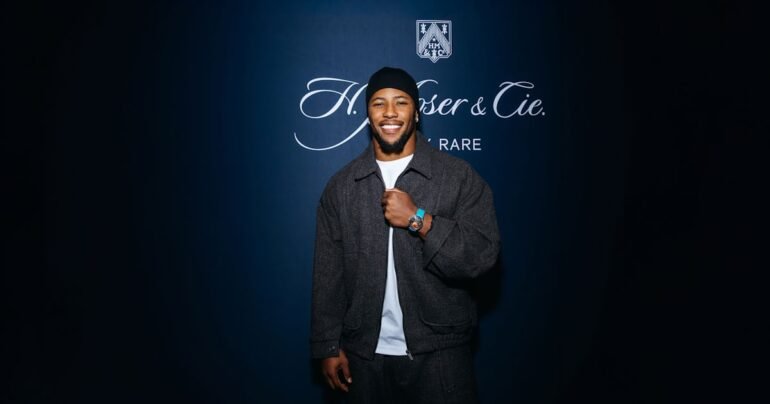 For him, it goes beyond the product. “I’m really all about relationships,” he said. “The conversations I’ve been able to have with [the Moser team] and the time we’ve spent…that really set the tone for me.” Barkley’s reputation—highly competitive but universally liked—makes him an ideal face for a brand looking to bolster its mainstream awareness in the United States. Bertrand Meylan, CEO of MELB Luxe Subsidiaries (the parent company of H. Moser & Cie.), echoed the sentiment. “We weren’t actively looking for an American football partner,” he told me. “But when we met Saquon—when we spent hours talking—it just became natural.” When asking his friends in the U.S. to gauge how fans view him, “Everybody told me: ‘Oh yeah, everybody loves him.’ He’s a good person. Close with his family. And a very rare talent. It corresponded well with the values of Moser.”