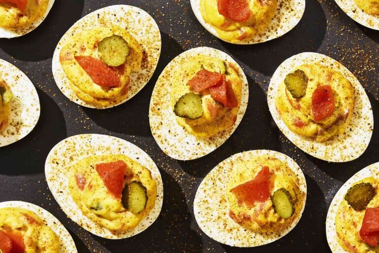 “Deviled eggs are fun because you can dress them up or down,” says Mina. Here, he upgrades a classic deviled egg filling with chopped smoked salmon, Dijon mustard, and cornichons.
