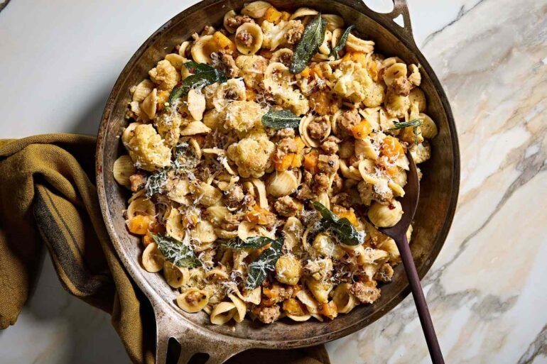 The technique here is all about layering flavor. Roasting cauliflower and butternut squash at a high temperature coaxes out their natural sweetness and adds caramelized depth. Meanwhile, melting butter until the milk solids turn golden and toasty creates a brown butter that infuses the entire dish with warmth. When the sausage is cooked and deglazed with white wine, those brown bits become pure flavor gold. Finally, tossing everything together with starchy pasta water and Parmigiano-Reggiano ensures a glossy, restaurant-style finish.