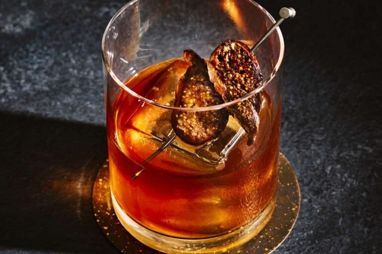 A riff on a classic Old Fashioned, this drink swaps the traditional sugar cube or simple syrup for a homemade caramelized fig syrup. Since figs are only in season in the summer months, reconstituted dried figs serve as the base for this syrup.