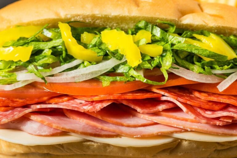 A creamy, tangy salad adds a fresh burst of flavor inside the sub. Shredded iceberg lettuce, pepperoncini, and thinly sliced red onion are mixed in a creamy dressing made with mayo, red wine or sherry vinegar, seasonings like dried oregano and red pepper flakes, salt, pepper, and optional shredded Parmesan.