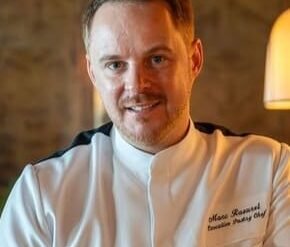 After prepping the fresh tomatoes, Tucci sweats Tropea onions (a sweet red onion from Calabria), yellow onions, and garlic in a large pan with extra-virgin olive oil. He details that once the alliums have started to soften, “I’m going to take all these nice tomatoes and stick them right in there,” transferring his sliced cherry tomatoes from the water to the skillet.