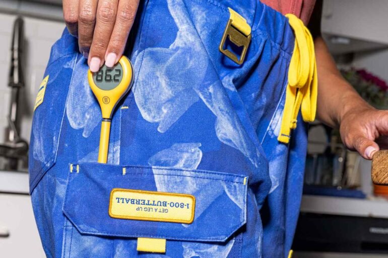 A dedicated pocket holds a meat thermometer, which is Butterball’s top-recommended tool for the big day. (And of course, there’s also a phone pocket to consult the Turkey Talk-Line’s help at a moment’s notice.) Meanwhile, towel and utensil loops keep the most-used tools within easy reach, while a bottle opener ensures holiday drinks stay flowing. To finish it all off on a personalized note, Butterball says cheeky, pun-forward iron-on patches for a fun, playful touch.