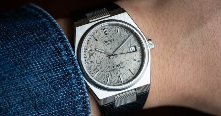 If you’re familiar with the more traditional steps to produce Damascus steel, that is, to stack different billets of steel together to then weld together piece by piece before eventually etching, the production method of the PRX takes a bit more modern industrial approach, using powders layered in a mold, then pressed at high heat to form a block of layered steel. The block is then CNC’d to produce the cases and dials, then finally finished. It’s certainly a much more cost-effective approach than the traditional method, and makes sense for a product of this price segment.