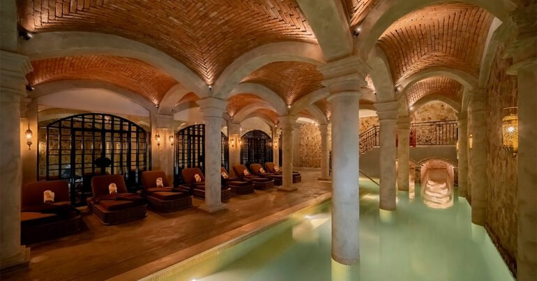 The spa’s facilities include thermal pools, hammam-style steam rooms, a Himalayan salt chamber, mud therapy room, and sensory deprivation pool. Guests can choose from treatments that use regional and natural ingredients, including a Cacao Experience Wrap, Wine Therapy, and a Lavender Ritual designed to restore circulation and balance. Each treatment includes access to the spa’s wellness circuit and relaxation areas overlooking the surrounding mountains.