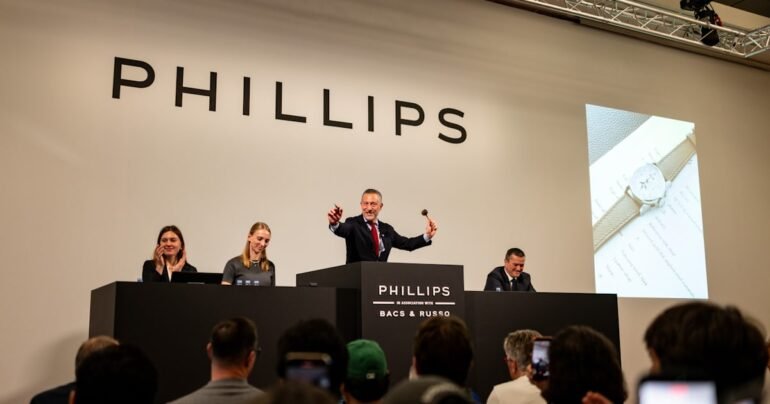 The room was packed and tense with anticipation well before Lot 23 got underway, and in an unusual development, it was announced that there would be no online bidding for Lot 23, and the steel 1518. Only phone bidders and those in the room were able to compete. Even before auctioneer Aurel Bacs had finished his introduction for the watch, a bidder seated in the room started the ball rolling, shouting out an offer of CHF “8 million”! In all, five bidders competed for the prize, with three raising their paddles in the room and two on the phone. It took a full 10 minutes for the winner, a phone bidder with a bid of CHF 12 million, to claim the prize.