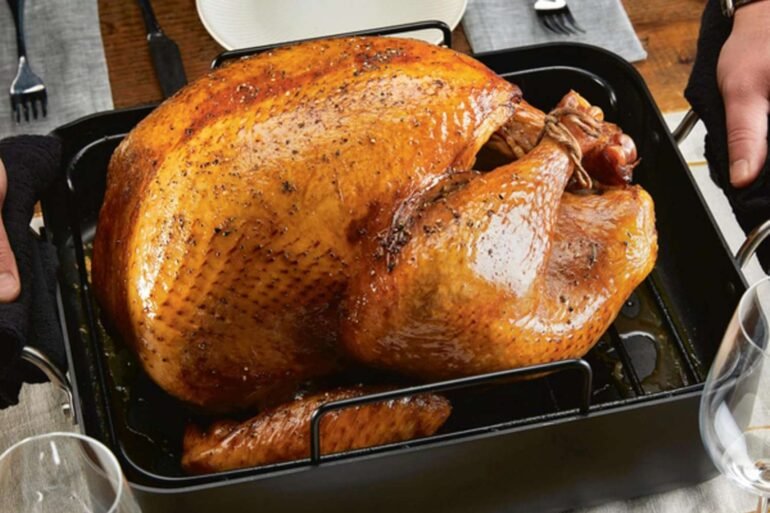 At 13 inches x 15.75 inches, it’s not the largest roasting pan around, but I used it to make a 14-pound, jerk rub turkey (it can hold up to 20 pounds), and it handled the job with zero fuss. The hard-anodized aluminum body conducts heat evenly, which I noticed when the turkey browned at the same pace everywhere, no awkward patchy spots to be seen. Plus, the removable V-rack allows hot air to circulate all the way around the bird. But the detail that really sold me is that both the pan and the rack are nonstick. You don’t have to wrestle the turkey out of the rack (always nerve-wracking), and when dinner is over, the post-meal cleanup doesn’t turn into an archaeological dig of caramelized turkey bits. I’d recommend a simple rinse with a sponge, since you really don’t need to soak it overnight.