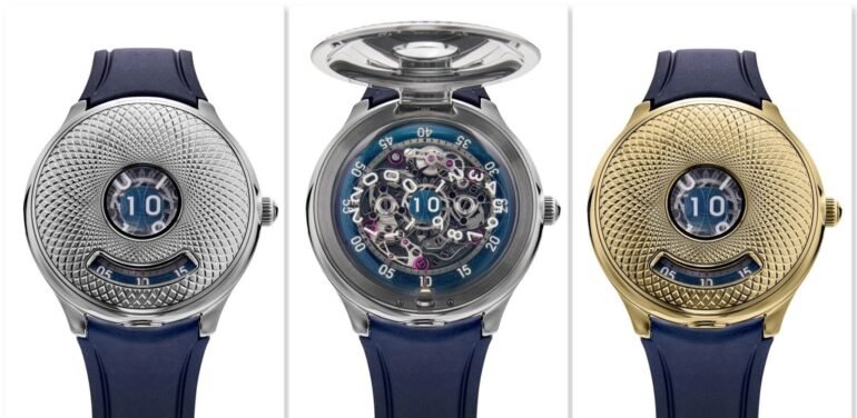 A decade after its revival, Czapek once again surprises with an intriguing creation — the Time Jumper. This is a modern interpretation of a 19th-century pocket watch crafted by François Czapek. The 40.5mm wristwatch with a half-hunter cover presents a fresh twist on traditional guilloché and partially conceals the new open-worked caliber 10.01. In celebration of Czapek’s 10th (re)birthday, the brand will release 100 pieces of the Time Jumper in steel and 30 in yellow gold. Each features a patent-pending jump-hour complication, displaying 24 hours on two discs, complemented by trailing minutes on a peripheral ring. If you’re wondering why you feel slightly woozy, dizzy, or hypnotized when looking at the watch with its cover closed, that’s because the three-dimensional guilloché pattern creates an optical illusion of a black hole; the central magnifying glass represents the event horizon, revealing the open-worked complication.