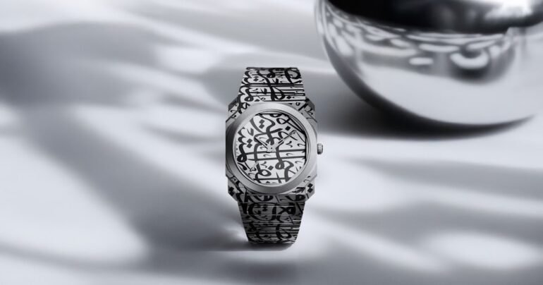 Bulgari’s newest collaborative endeavor, utilizing the blank canvas of the Octo Finissimo, is a new collaboration that brings to life the words of His Highness Sheikh Mohammed bin Rashid Al Maktoum, Vice President and Prime Minister of the United Arab Emirates and Ruler of Dubai, as beautiful, cultural, wearable art. The 40mm by 5mm sandblasted titanium case features laser-engraved calligraphy from Sheikh Maktoum saying, “The future will be for those who can imagine, design, and implement it. The future does not wait, but it can be designed and built today.”
