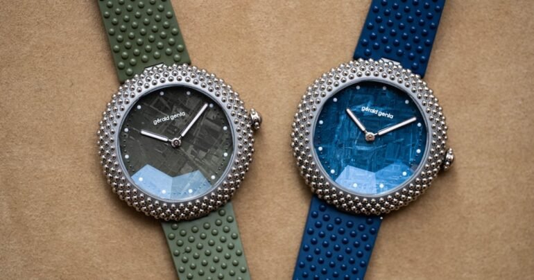 234 polished white gold beads are applied onto a matte sandblasted grade 5 titanium case for contrast, while the new larger crystal also gets the faceted octagonal design from its predecessors. In an interesting Easter Egg of sorts, the Super-LumiNova for the hands and five-minute markers all emit a subtle pink hue, a tribute to Genta’s favorite color.