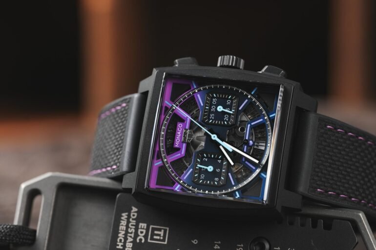 Even a casual F1 observer (I count myself in this category) can appreciate the spectacle of a night race. It’s a very different aesthetic experience than a race run during daylight hours, and the new limited edition Monaco seen here really leans into that night race vibe with some dramatic applications of color throughout. To start, it’s built on a 39mm titanium case that has been DLC coated, and given a skeletonized dial treatment that we’ve seen from a bunch of earlier Monaco limited editions at this point. Where this watch really sets itself apart though a gradient effect that is layered throughout the dial and unique lume application.