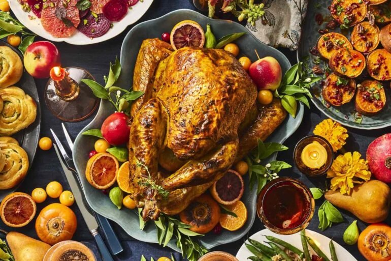 Chef Maneet Chauhan’s roast turkey delivers highly seasoned, crispy skin thanks to a yogurt marinade spiced with tandoori masala. The marinade works double duty, helping the meat to stay tender.