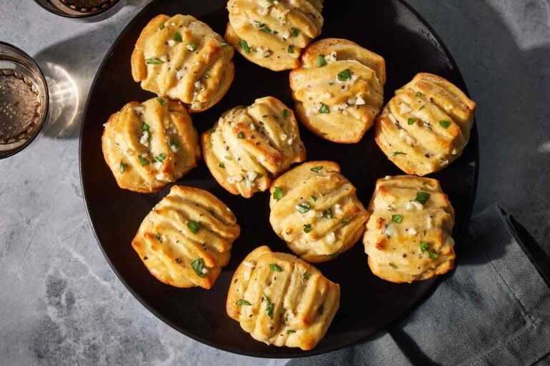 These pull-apart rolls are a true showstopper. Golden and crisp on the outside, pillowy and fragrant within, they’re the kind of roll that can’t be passed over. Inspired by classic garlic knots and fantail rolls, this version layers a rich, crème fraîche–enriched dough with fragrant garlic-basil butter for a deeply savory, bakery-quality finish. The rolls’ unique fan shape not only looks impressive but also creates endless buttery layers that bake up tender and tear apart beautifully.