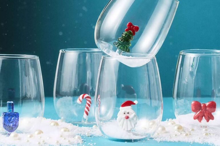 Your holiday party glassware deserves a refresh. The stemless wine glass is a classic choice, but Anthropologie’s version has a translucent sapphire dreidel peeking out from the base that stands as the crown jewel. You can also choose from four other holiday designs (a candy cane, a Christmas tree, Santa, and a holiday bow).