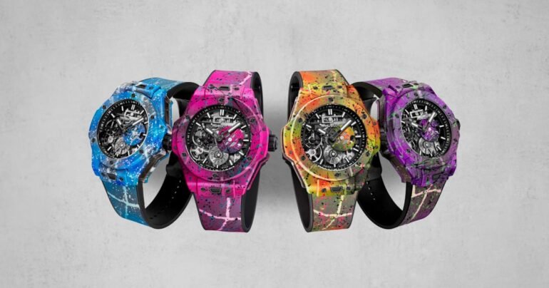 A collection of four different colorways of the 44mm by 15.3mm Meca-10-powered Big Bang models that I can only describe as “Paintball Pollock” vibes, Hublot takes its in-house manually wound caliber and encases it in composite concrete cases painted by hand in splattered, UV-reactive paint. The “Magic City” in purple and green that reminds me of everyone’s favorite dinosaur, “Vice” goes all hot pink with a splash of blue, the “Big Water” comes in bright blue with greys thrown in, and my favorite of the four is probably the yellow, orange, and green “Sunshine” edition with subtle (if you can even use that word here) bits of pink.
