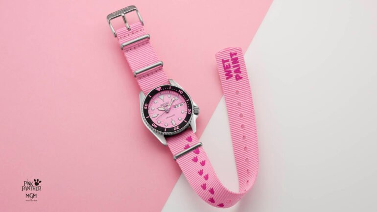 Thinking back to the good old days of the video store, there were three cartoon series that my siblings and I picked more than any others: Looney Tunes, The Simpsons, and The Pink Panther. And while the former two long-running shows have had many hundreds (and even thousands) of tie-in products well into the 2020s, Pink Panther doesn’t seem to hold nearly the same level of pop culture ubiquity these days. Still, that shade of Pepto Bismol pink, visible from space, immediately brings to mind the iconic theme song and mischievous hijinks of the titular Panther and his foe, the bumbling Inspector Clouseau. Seiko has taken up the Pink Panther mantle with a new limited edition Seiko 5 Sports watch, and the bright hue isn’t the only clue to be found.
