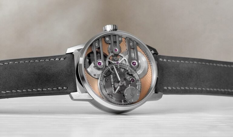 The new Armin Strom Gravity Equal Force Ultimate Sapphire Salmon (ref. ST24-GEF.SAL / CHF 27,500) might look familiar. That’s because you probably read about the Gravity Equal Force Ultimate Sapphire Blue on Fratello. Armin Strom has reimagined its in-house micro-rotor movement by pairing it with a salmon-hued, PVD-coated mainplate. The tasty background is framed by a stainless steel 41mm case and paired with a gray nubuck strap featuring matching stitching and keepers.