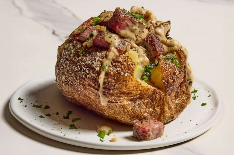 This fun mash-up takes its cues from traditional steak au poivre, where tender steak is cloaked in a creamy peppercorn sauce, and the British jacket potato, known for its ultra-crisp skin and buttery interior. Coarsely ground black peppercorns form a crisp crust on strip steak seared in a hot cast-iron skillet until deeply browned on the outside and juicy within. Meanwhile, russet potatoes roast directly on the oven rack until their skins are shatteringly crisp and their centers fluffy and tender. Once split open, the potatoes become vessels for the peppery steak and its rich pan juices.
