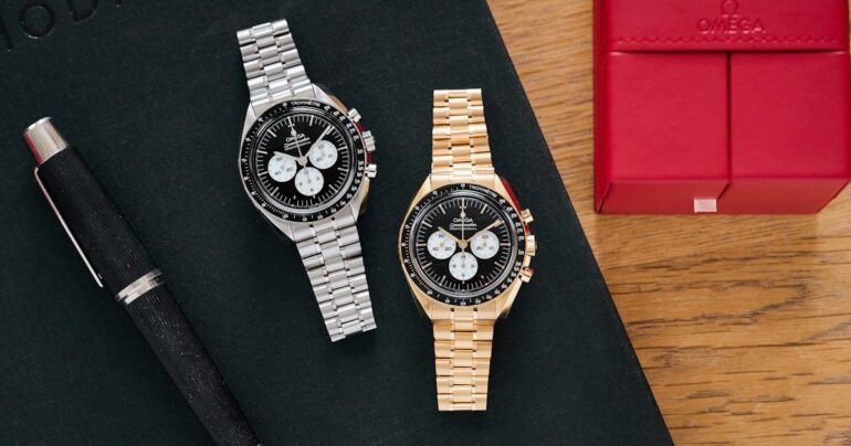 The top layer, the main dial, is executed in an ultra-glossy polished black surface with a varnished and lacquered finish. At the same time, cutouts for the three subdials reveal that the bottom layer is also glossy, but in that contrasting lacquered white finish. Each dial layer gets printed markers and numerals in the inverted color, with the main minute track and text printed in white, and the registers getting numerals and indices in black. The handset and applied markers match the main case metal of each variant, while the applied Omega logo hints at the sapphire-sandwich configuration of these new Moonwatches – sapphire crystals on the front and the back, rather than hesalite.
