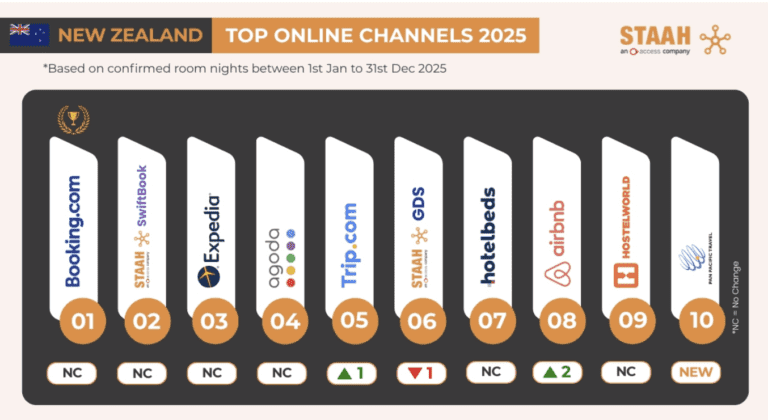 New Zealand’s booking landscape in 2025 reflects balanced demand between international visitors and an active domestic market. Booking.com led the rankings, followed by STAAH SwiftBook, which continued to gain traction as properties emphasised personalised guest relationships and direct conversion.