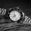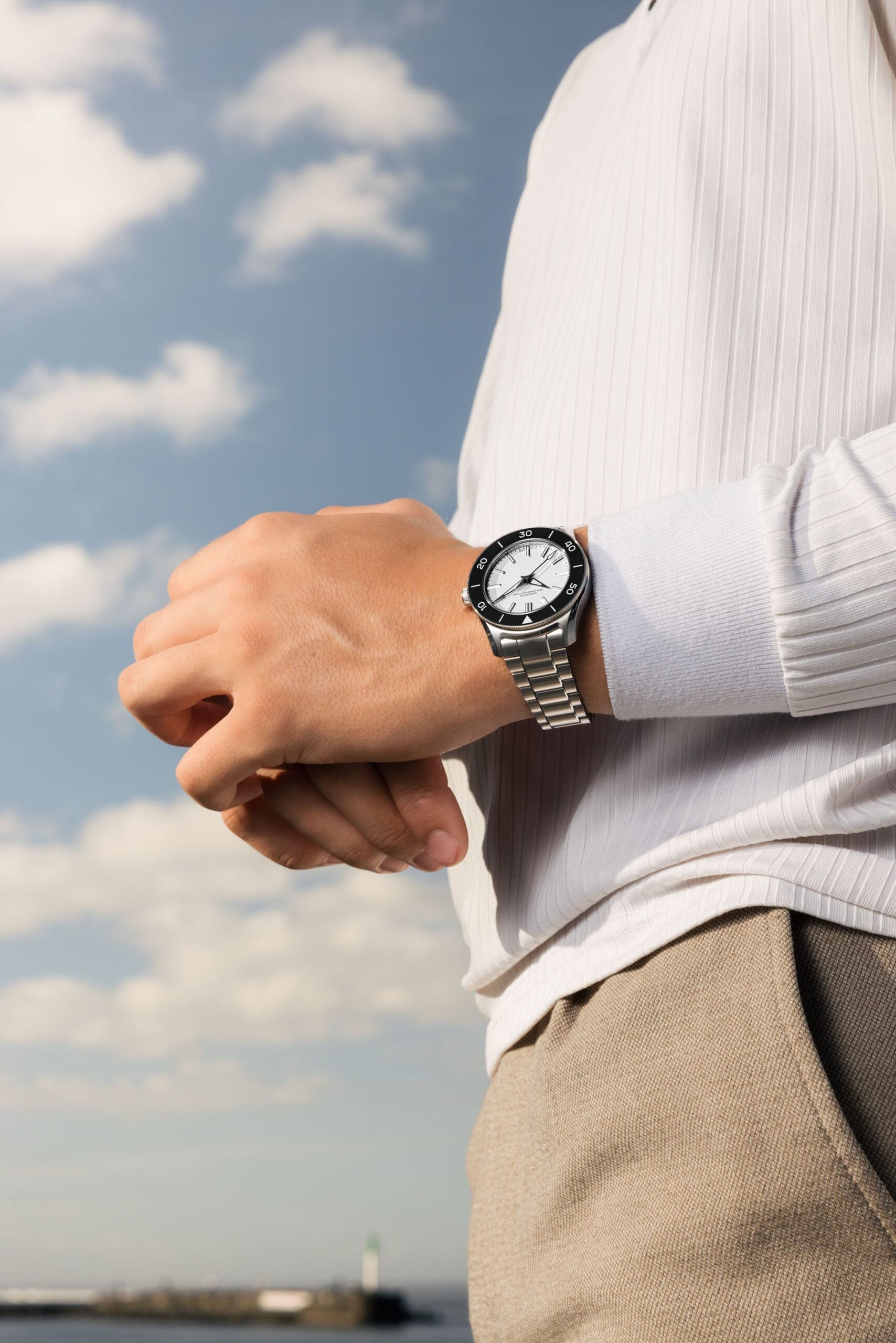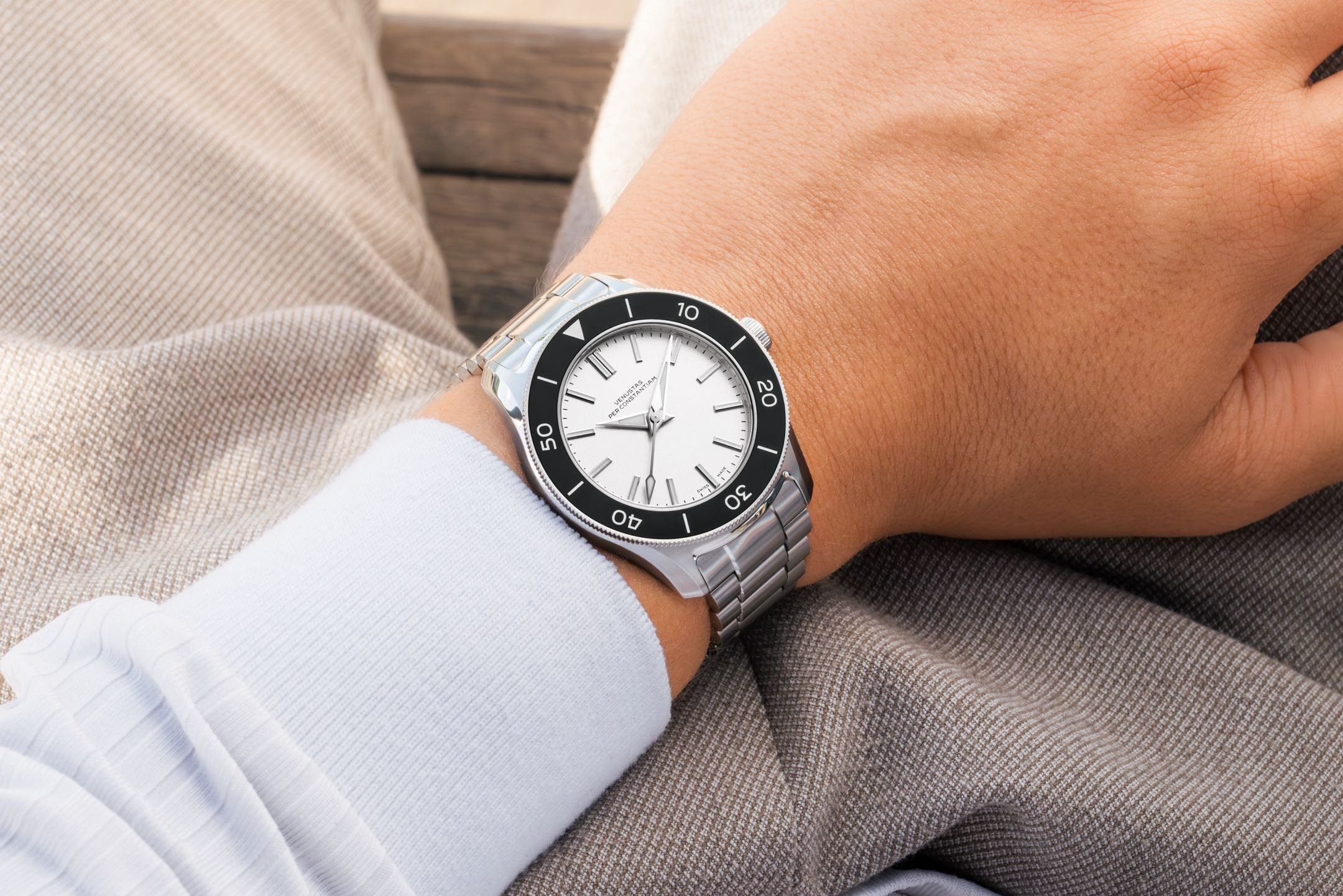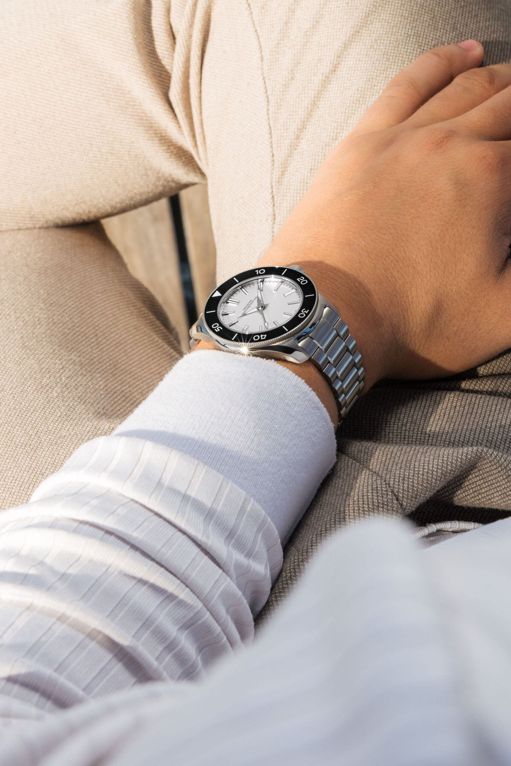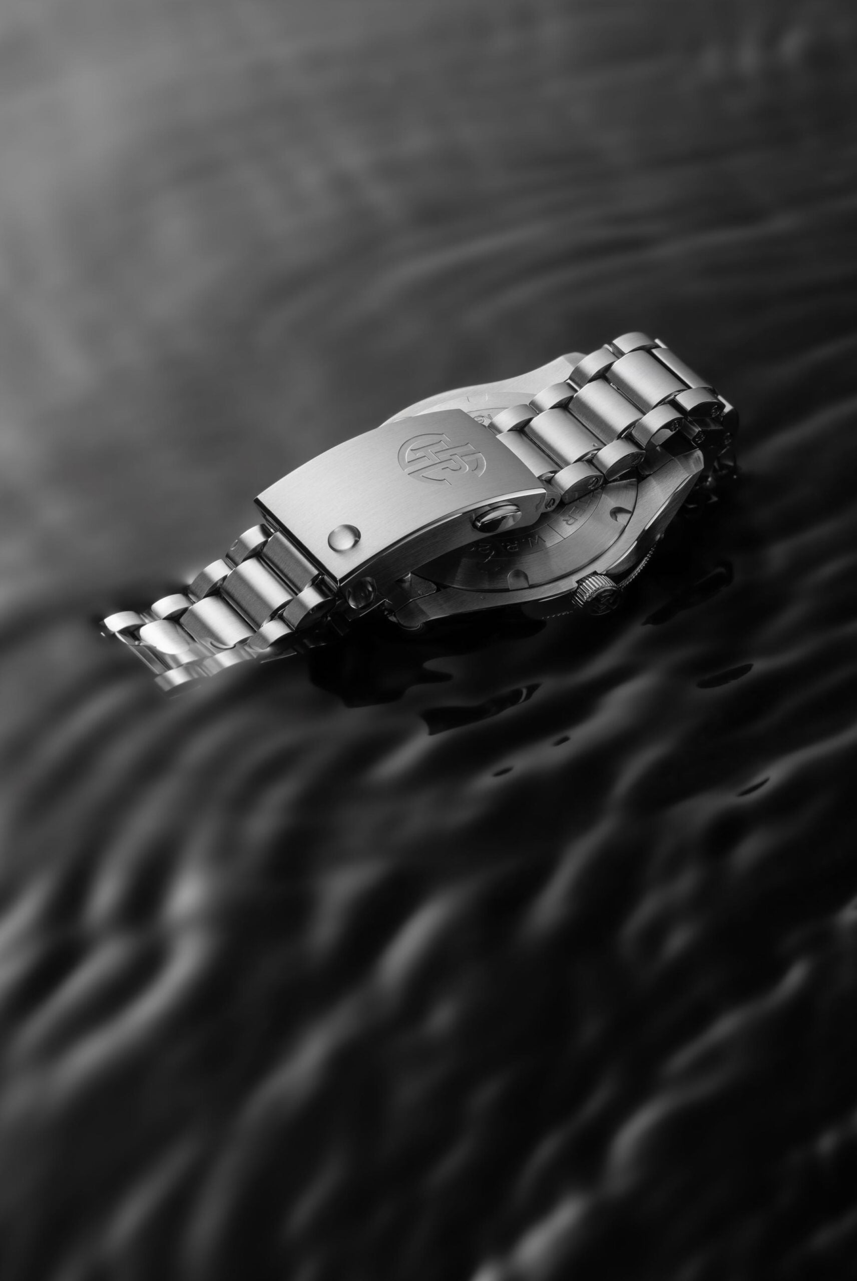 Topping the elegant case is a 120-click unidirectional bezel featuring a matte black ceramic insert with a white diving scale. The white numerals and markings are flush and look almost like an ivory shade rather than a hard, sterile white. Additionally, they are luminescent and emit a bright blue glow in the dark. As on the Type 37HW, the case, bezel, and bracelet have a hard surface coating, which prevents scratches from accumulating as quickly as they would on untreated stainless steel. As an owner of a Type 37HW, I can say that the coating significantly enhances the daily pleasure of wearing the watch.