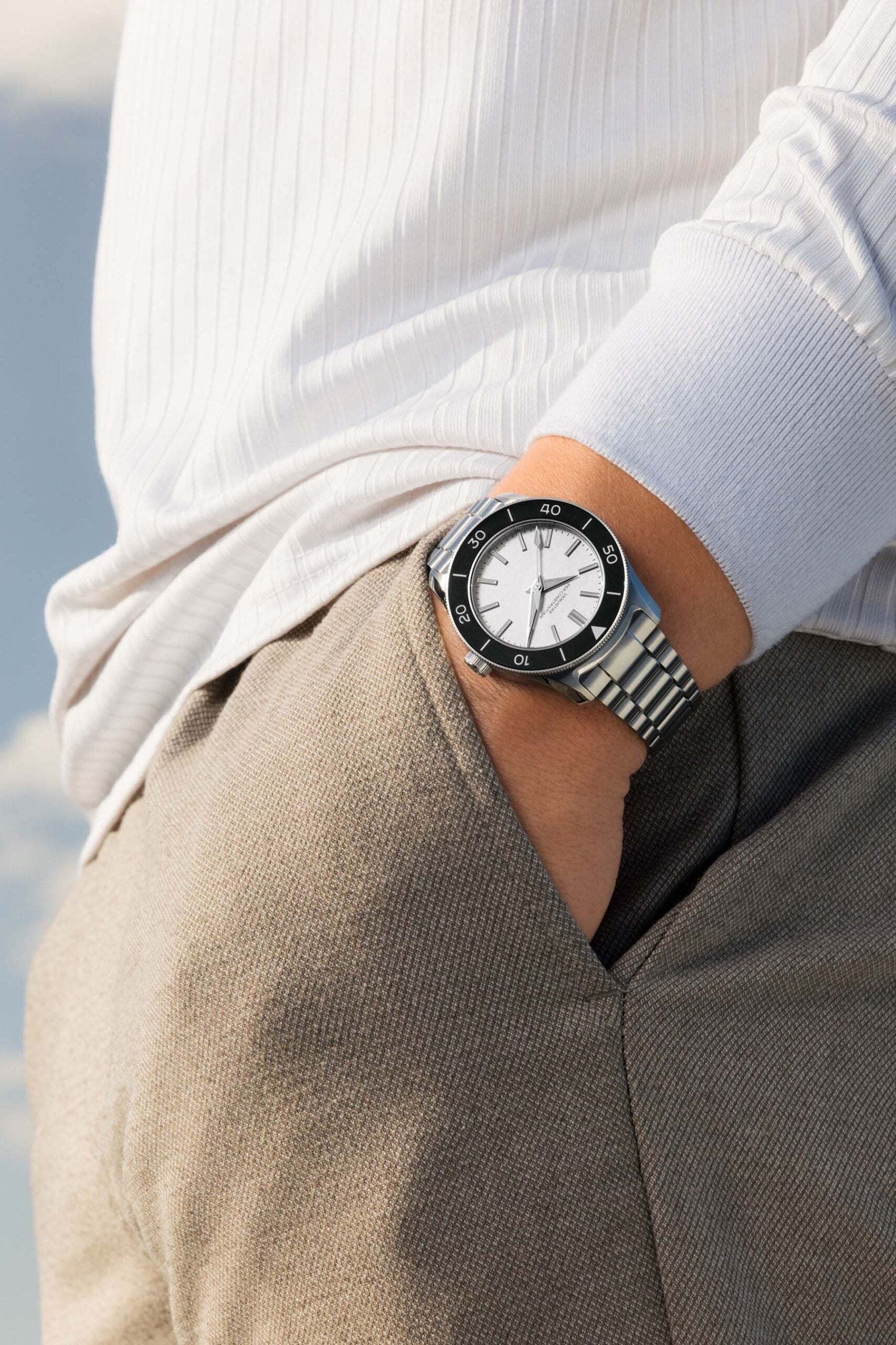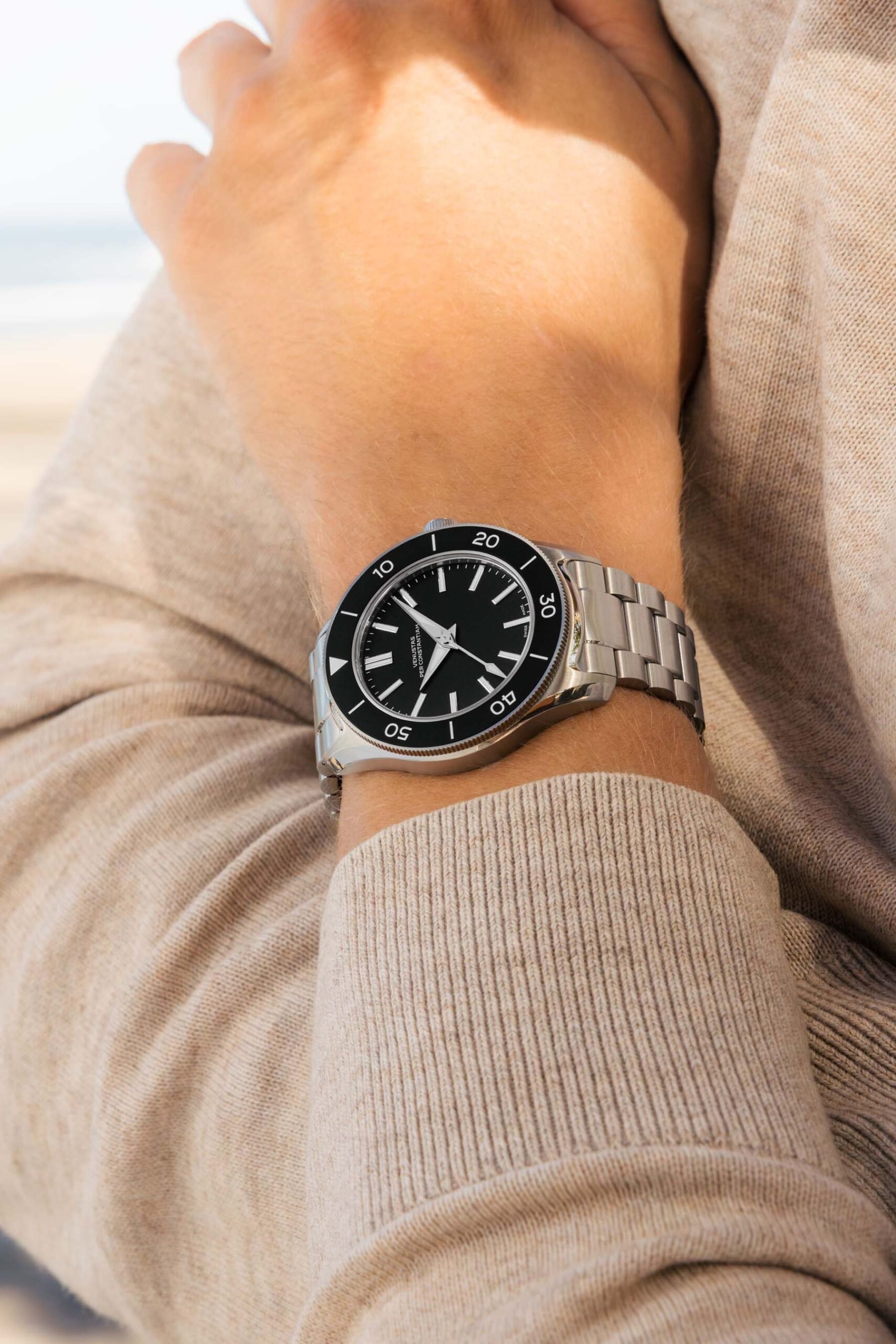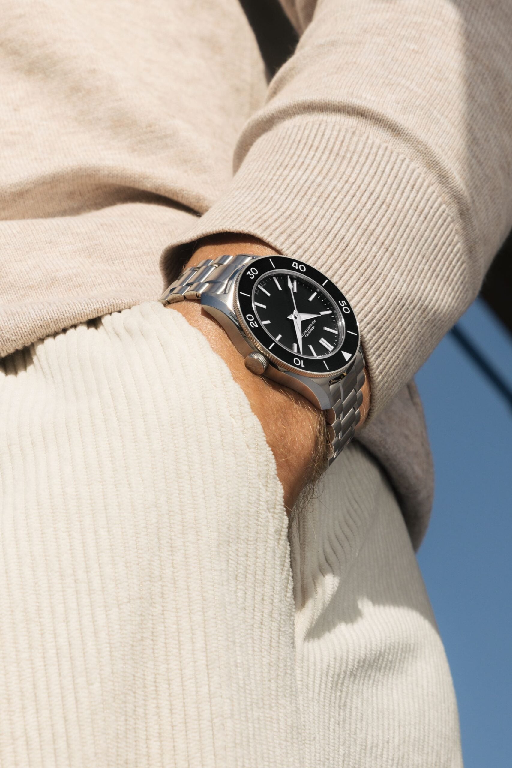 Additionally, the interplay between the bezel and the dial is based on some smart geometrical design solutions. The lumed triangle at the 0/60-minute mark features sides placed at a 30° angle. If you continue the lines across the dial, they end up at the inner bezel edge in the middle of the 20 and 40-minute markers. Draw a line between those two points as well, and you get a perfectly balanced triangle. Additionally, you can draw straight lines between the different markers across from each other on the bezel that will also be placed at the same angles. While these details are exciting to design enthusiasts, they also result in an aesthetic that looks balanced and logical to anyone.
