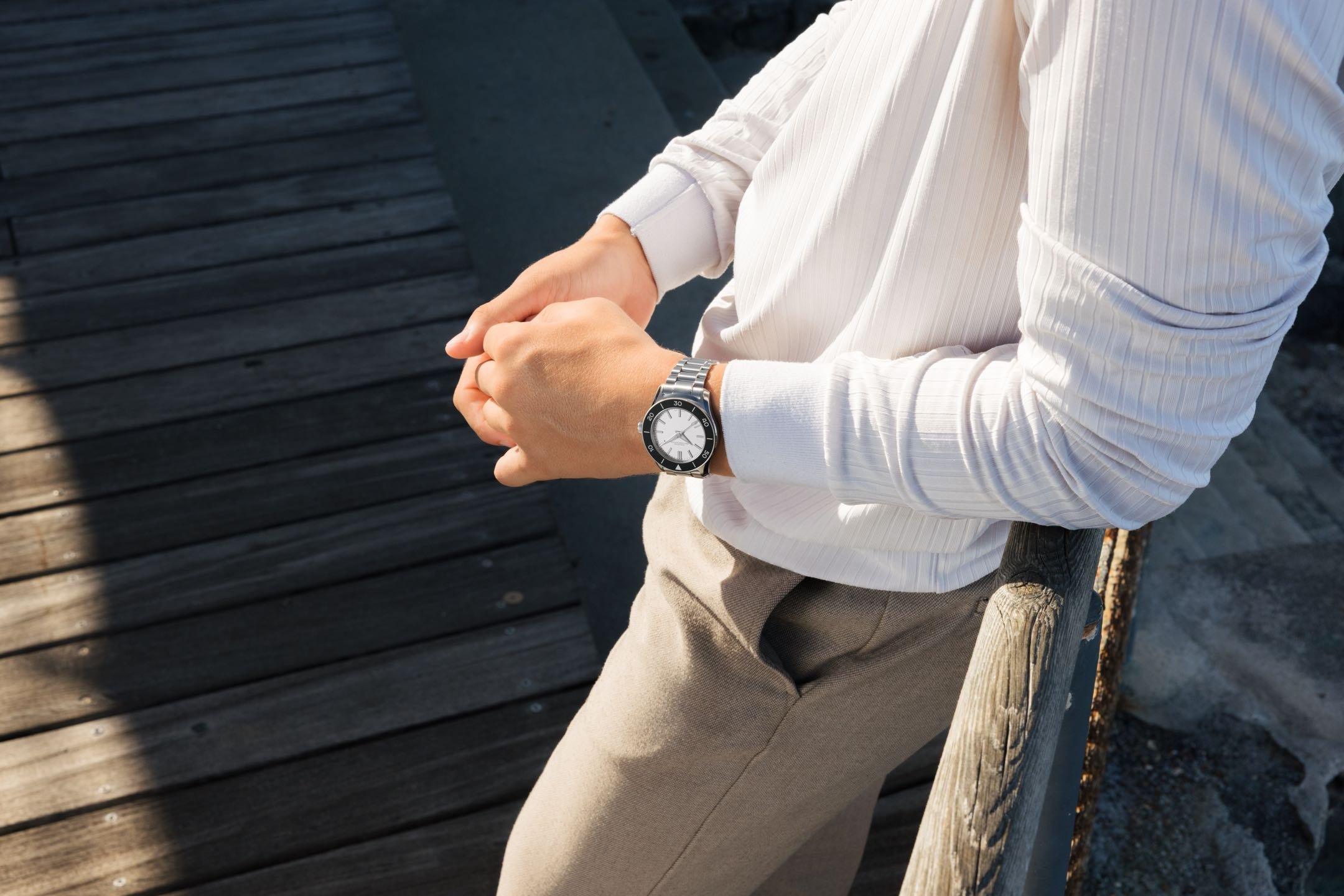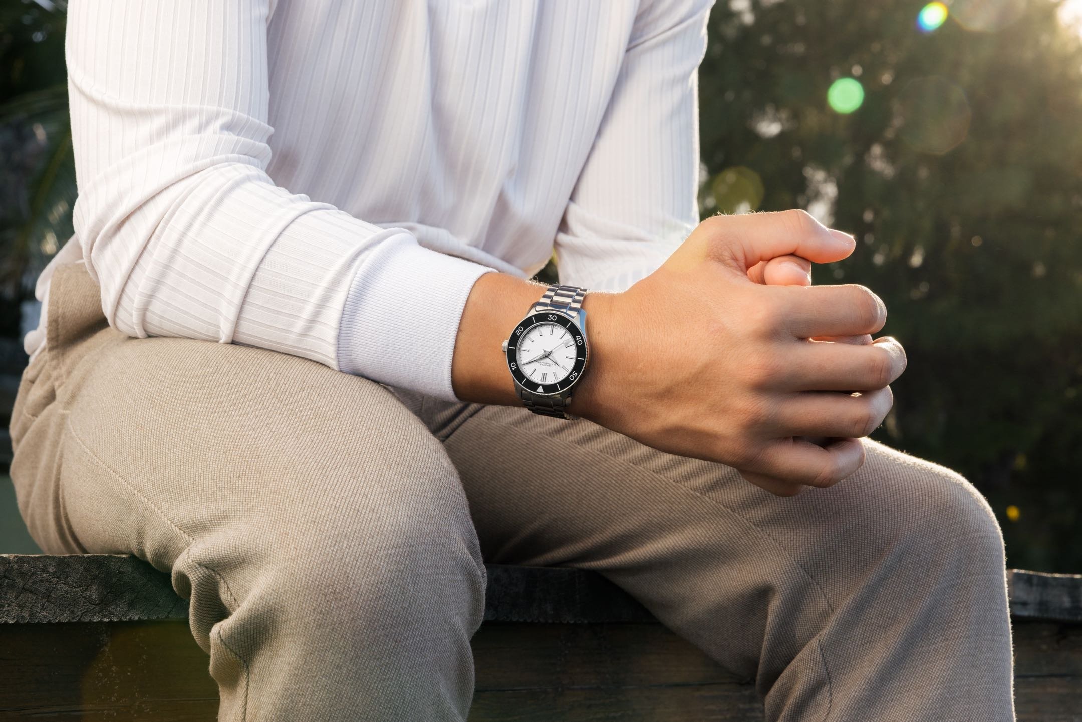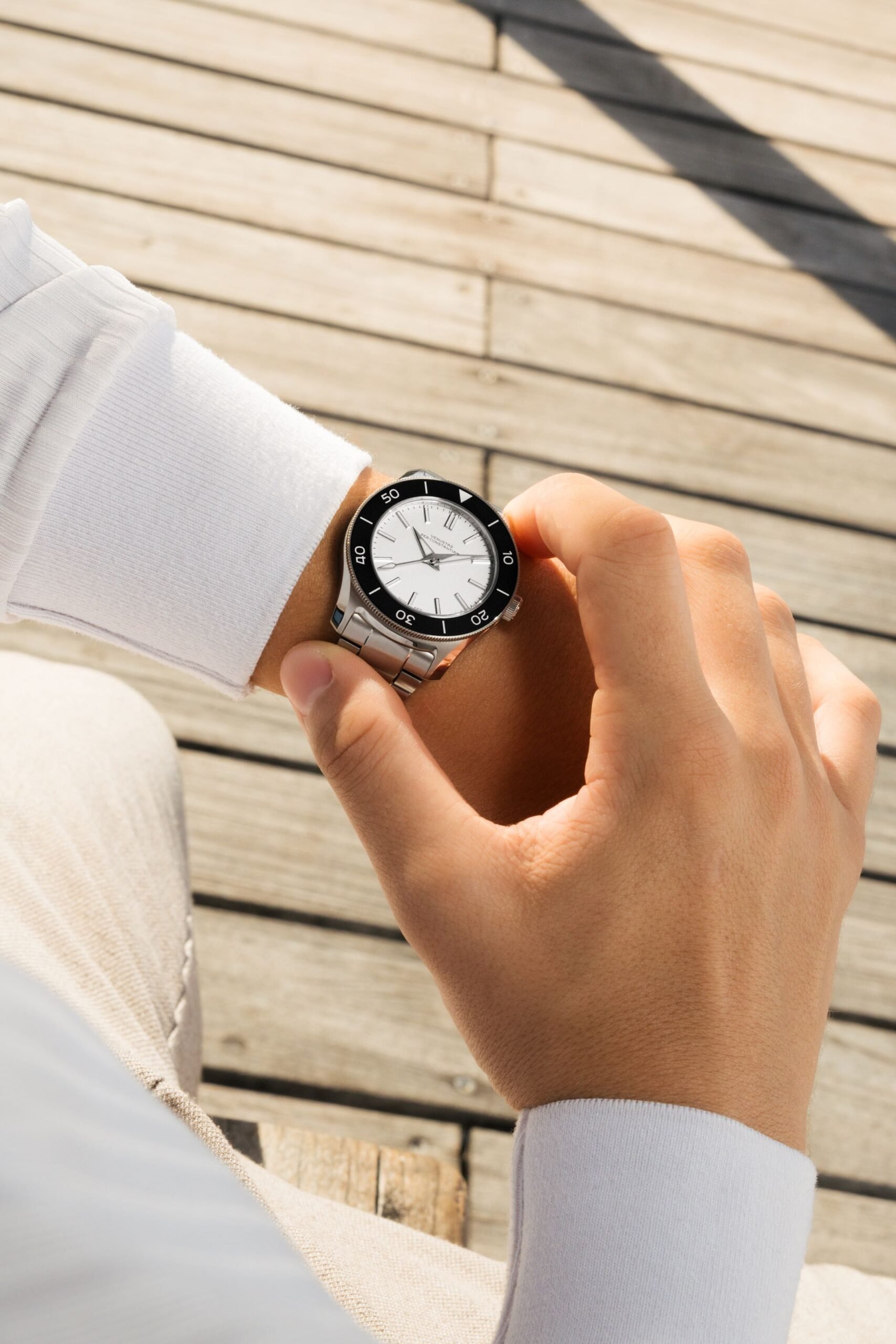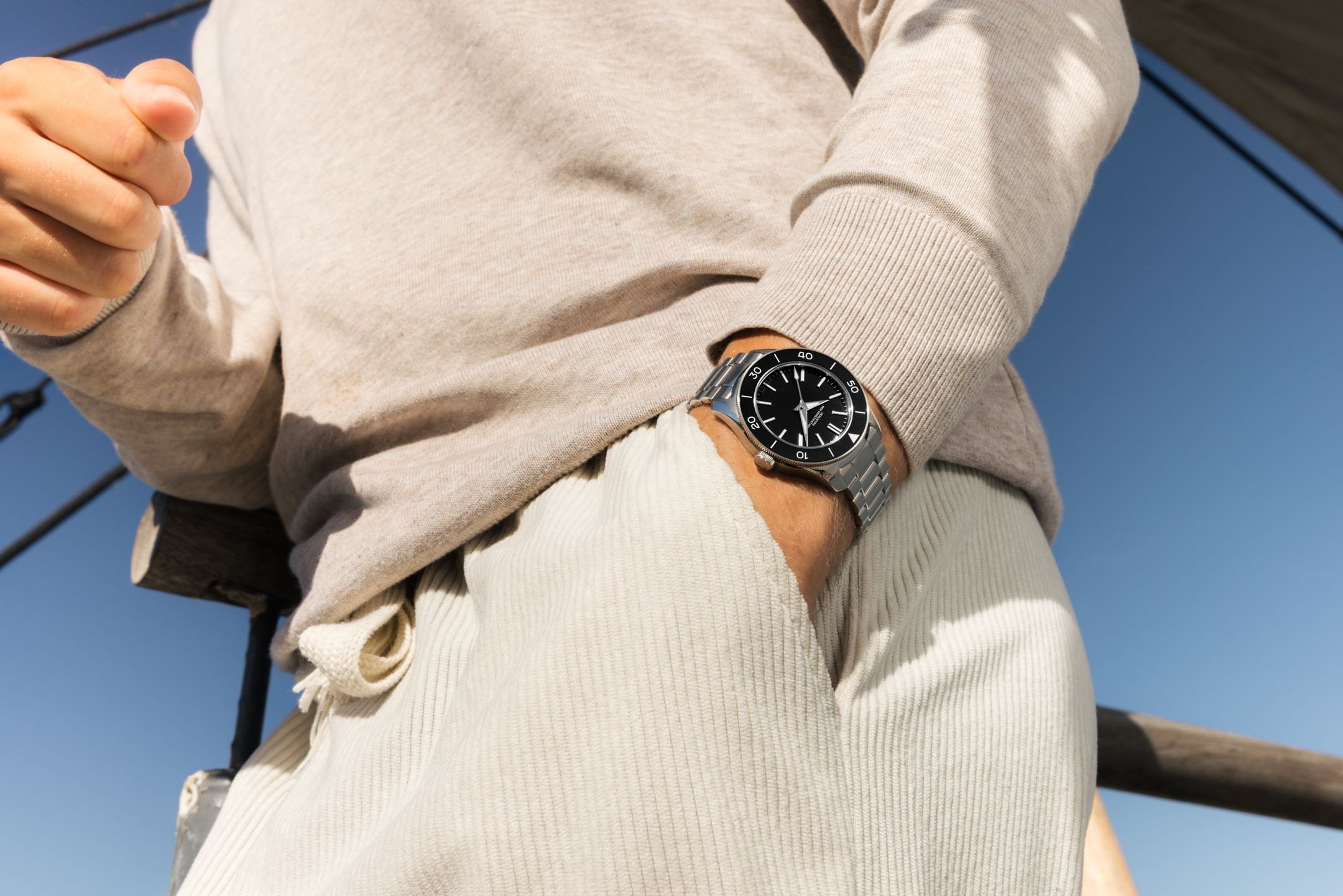 Additionally, the interplay between the bezel and the dial is based on some smart geometrical design solutions. The lumed triangle at the 0/60-minute mark features sides placed at a 30° angle. If you continue the lines across the dial, they end up at the inner bezel edge in the middle of the 20 and 40-minute markers. Draw a line between those two points as well, and you get a perfectly balanced triangle. Additionally, you can draw straight lines between the different markers across from each other on the bezel that will also be placed at the same angles. While these details are exciting to design enthusiasts, they also result in an aesthetic that looks balanced and logical to anyone.