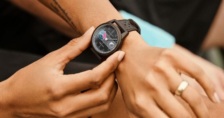 Certainly sporty and wearable, the case is 39 millimeters in diameter, boasts a fairly compact 47 millimeter lug-to-lug measurement, and is 100 meters water resistant. The screw-down crown features the Racquet logo, and the watch comes with a nifty black tennis ball (take that to your fancy country club and see what happens) as well as two straps, a black calfskin rally strap and a two-piece stretch fabric strap that features a glowing stripe down the center.