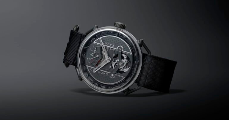 Launched at this spring’s Retromobile classic car show in Paris, Chopard and Zagato are teaming up for the lightest titanium watch the watchmaking maison has ever launched. The new Chopard Zagato Lab One Concept does away with excess weight by stripping away features like dials or fully formed cases. Instead, this is all about weight-to-power (or maybe weight-to-horology). The movement mainplate functions as the dial, rhodium-finished and featuring the Zagato “Z” motif, plus chamfering. There, you can see the fuel-gauge-inspired power reserve indication, hours, minutes, and the 60-second tourbillon (housed in an aluminium carriage).