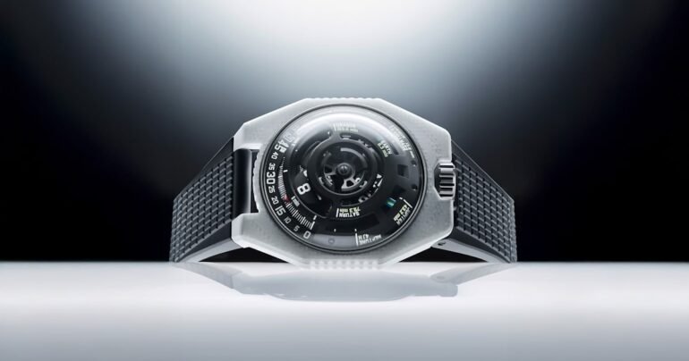 If you ask me, the UR-100V is a modern classic. While it looks like it has a round dial, the UR-100V is known for the brand’s signature satellite hours display, in which the hour disc rotates around the lower segment of the dial, while an arrow points out the minutes on a track. But the UR-100V LightSpeed goes further, with a three-dimensional planetary display for the the eight planets of the solar system (RIP Pluto). Each position shows the exact time for sunlight to travel from the Sun to that planet, so when the hours satellite leaves the minutes track, it instead tracks that time.