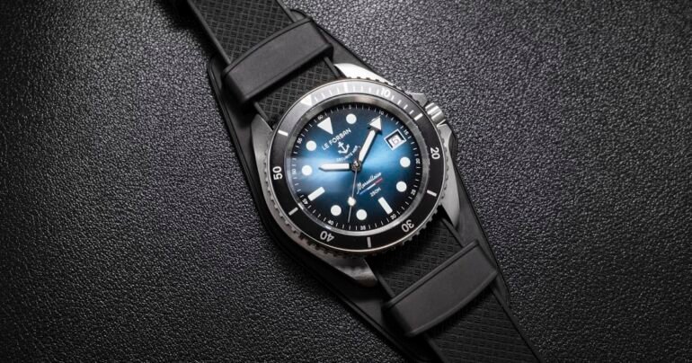 There’s a lot of text on the dial, with ‘LE FORBAN’ (which translates to ‘outlaw’ or, in a seafaring context, ‘pirate’) on top, with a rather generic anchor logo below. Then we’ve got ‘SECURITE MER’ – ‘Maritime Security’?? Weird and cool, I say. Below the handset is the Marseillaise model name in script, perched above the bleu, blanc et rouge colors of the French flag. Finally, we’re reminded of the 250 meters of water resistance to hammer home the diver’s functionality.