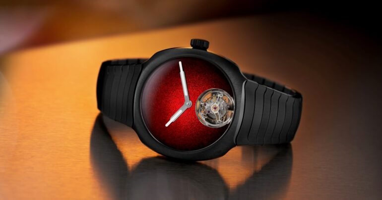 Believe it or not, H. Moser & Cie. has never made a watch out of ceramic before. Yes, this is the same brand known for its foray into ridiculous materials, including… cheese. But somehow, ceramic was never on the table, save for a bezel insert or two. That changes this week with the brand’s new Streamliner Tourbillon Concept Ceramic. As with the other watches under Moser’s ‘Concept’ series, the dial on the new Streamliner is pared back in an otherwise familiar silhouette. No indices or logo interrupt the intense red fumé grand feu enamel dial, allowing the hammered texture of the underlying white gold base to shine through. A pair of distinctly Moser hands, with three-dimensional Globolight inserts at their tips, sits quite legibly at the center, though legibility might not be a functional priority without any minutes track.