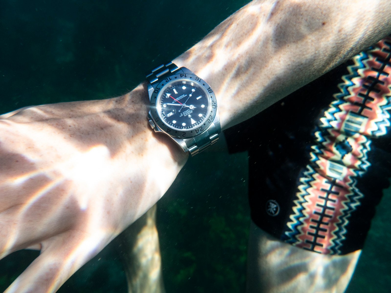 Underwater, the watch doesn’t shimmer like a dedicated diver. There’s no rotating bezel to time your set, no oversized luminous markers screaming for attention. Instead, the dial remains composed. The red GMT hand, that small flash of adventure, cuts across the black dial with quiet purpose. It’s a reminder that this watch was conceived not for beaches but for caves, expeditions, and the tracking of time beyond the horizon. And yet, it feels entirely at home in saltwater.