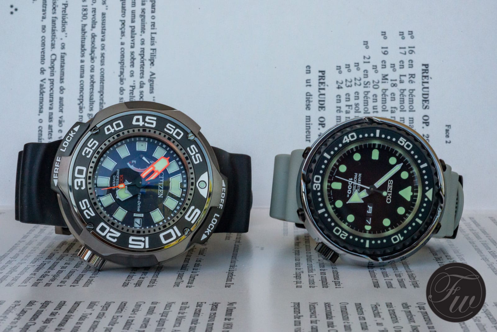 Citizen Promaster Eco-Drive Professional Diver 1000m next to Seiko Marinemaster Professional “Tuna” SBBN029