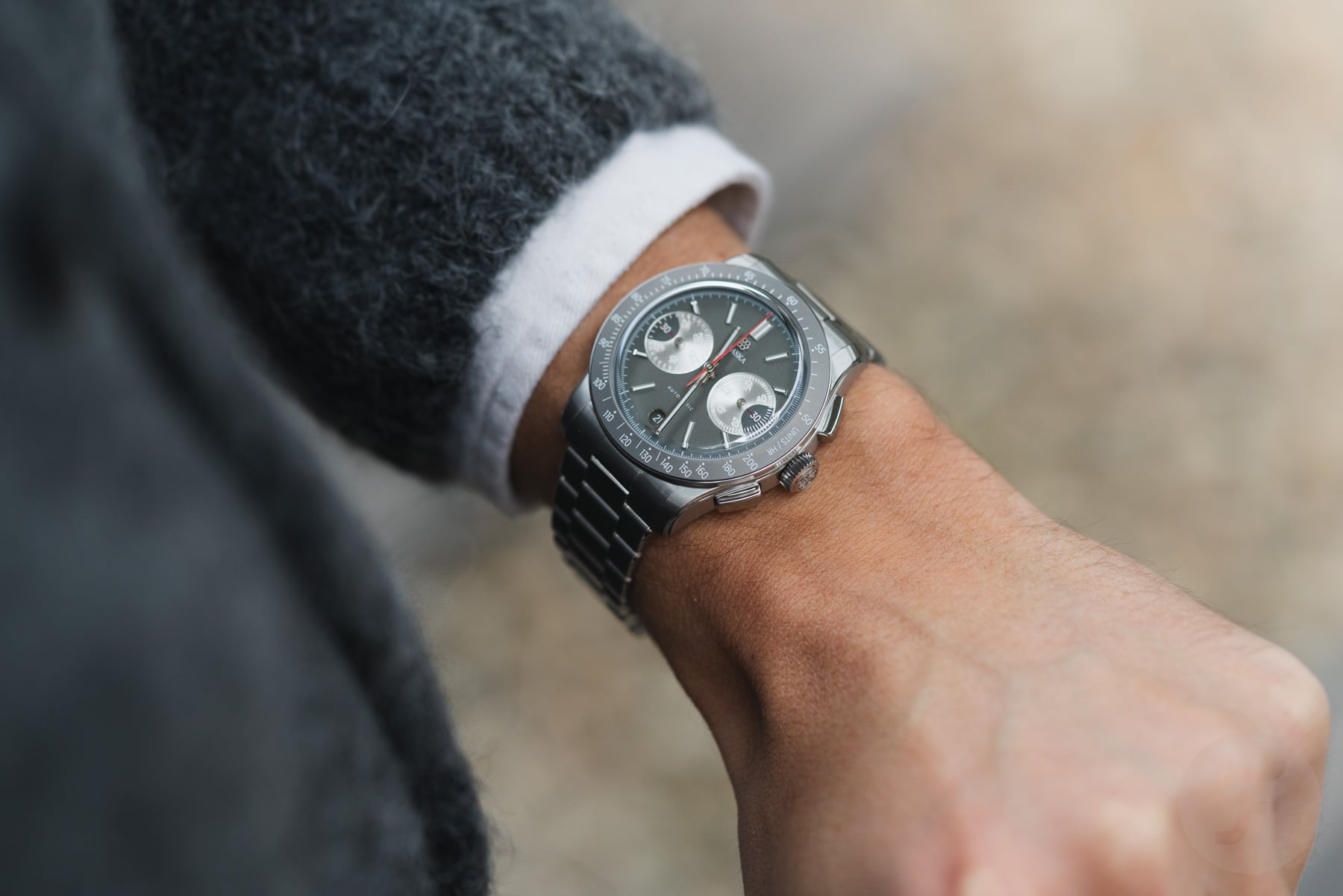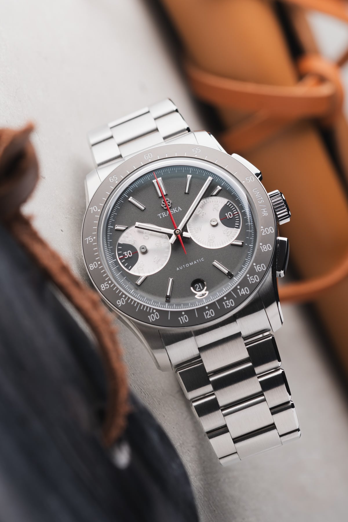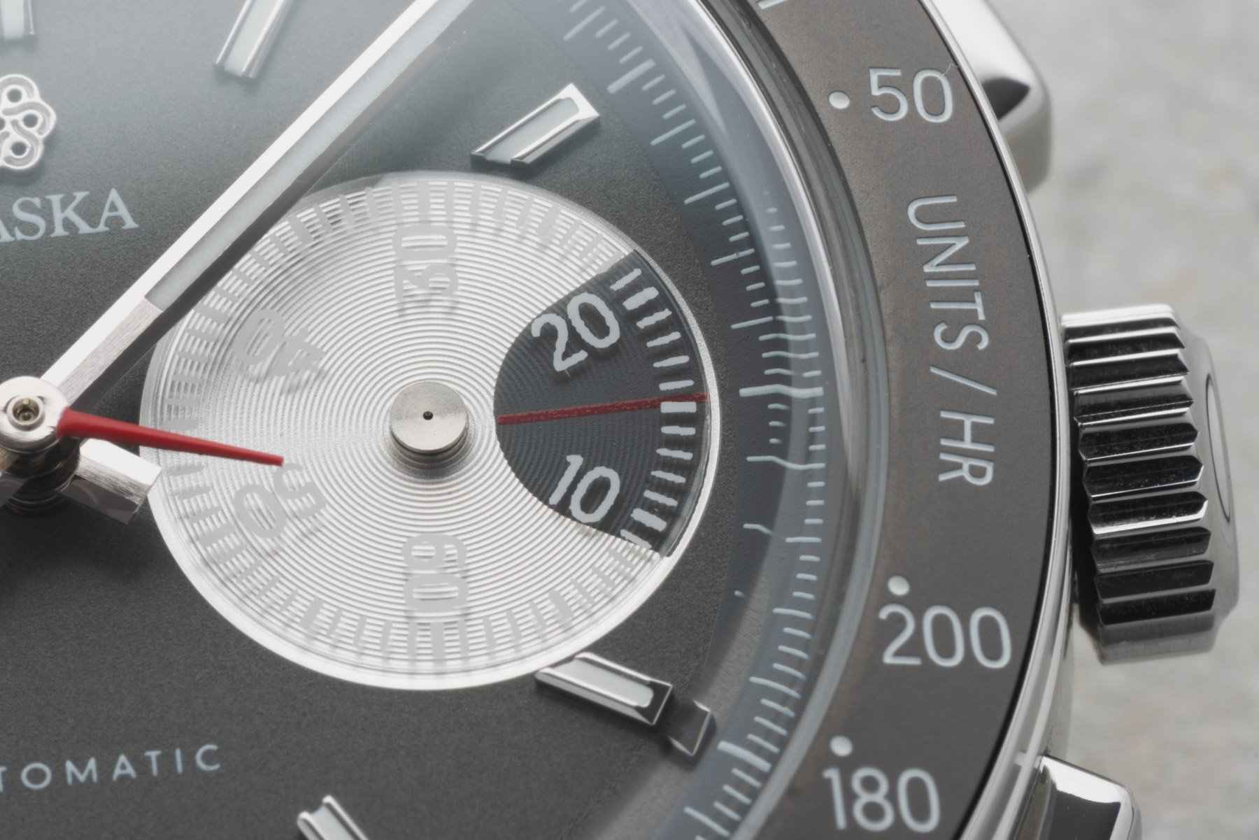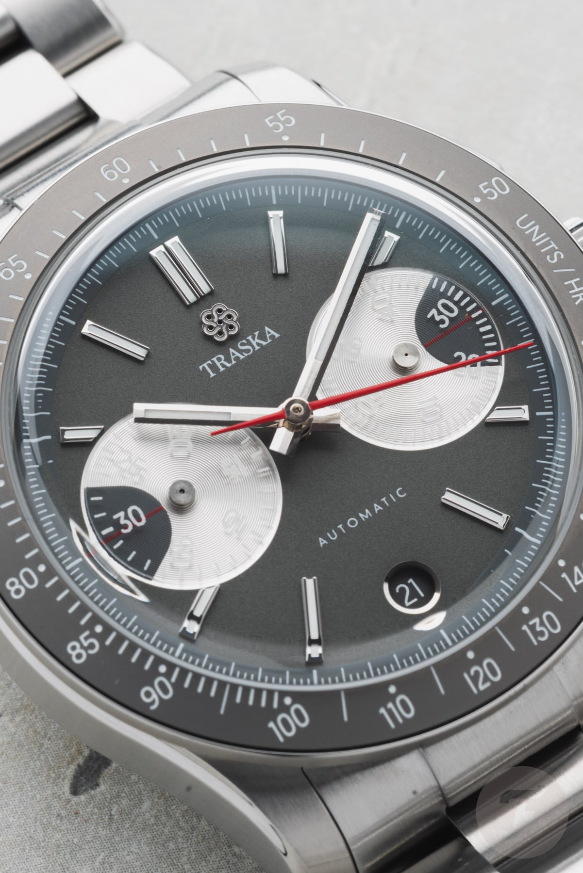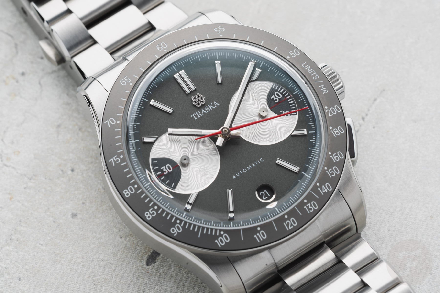 The bezel features a tungsten insert that complements the dial’s gray tone nicely. Traska chose tungsten for its scratch resistance, and it also adds a nice flair to the watch. As you can see, the insert doesn’t feature a normal tachymeter scale. The white tachymeter scale is compressed to a range of 200–50 units per hour. This range is less extreme than we usually see and, therefore, is more applicable to measuring things in “normal life” rather than in the world of racing.